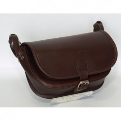 Bardzo oryginalna ,torebka na długim pasku polskiej produkcji. Wykonana z surowej skóry juchtowej w brązowym kolorze . Zapinana na klapę z klasyczną stalową sprzączkę . Po podniesieniu klapy : 2 komory z przegrodą (kieszeń na suwak) z przodu kieszonka na klucze z oczkiem do zapięcia oraz malutka kieszonka z klapką zapinaną na napę. Wewnątrz 3 miejsca na długopisy.